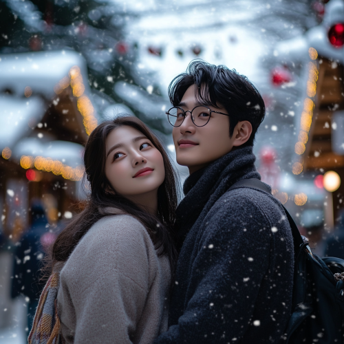 Upper body shot, Portrait, front view, hyper realistic, winter, afternoon, snowy, korean Couple, European country style, fairytale atmosphere, lovely, snowy village with Christmas trees, decorations, large squares, festivals, Canon EOS R5 with a 200mm lens, --style raw --v 6.1 --ar 1:1