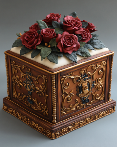 Create a cake that has a magical music box and jewelry box design theme from Versailles. Use wood tones and burgundy red and gold metallic colors. Red roses and leaves. Gold Royal icing filigree and paisley and swirl designs.