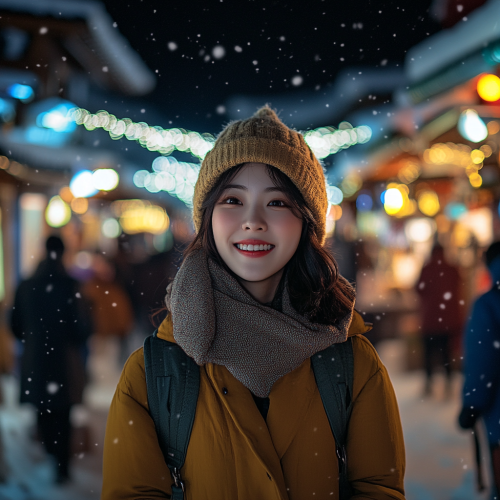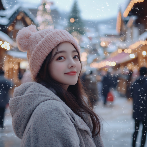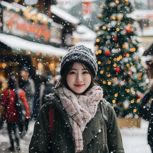 Close-Up shot, front view, hyper realistic, winter, afternoon, snowy, korean Solo, European country style, snowy town with Christmas tree, decorations, wide square, festival, many people on the street, beautiful fairytale atmosphere, brightly smiling white woman, Canon EOS R5 with a 200mm lens, --style raw --v 6.1 --ar 1:1