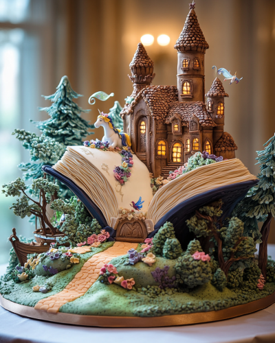 Create an extremely tall and gigantic beautiful cake design that features a very large and wide open story book. Large Magical fairy and a Large beautiful Mermaid and a Large magical unicorn and a magical rainbow pathway and a Large pirate ship and very tall trees. This cake design sits on a large dessert table with curtains in the background with spotlights on the cake. The cake is displayed in the corner of a grand ballroom. --ar 4:5 --v 6.1 --stylize 300