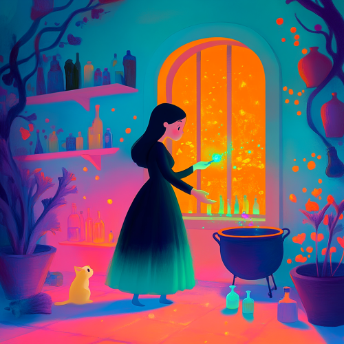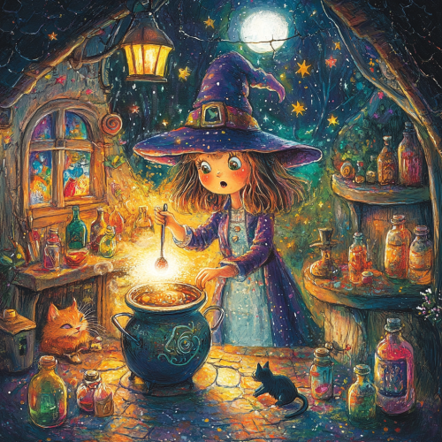Children's book cover, warm and bright scene, witch inside a house mixing potions, casting spells with a magic wand, surprised expression, a small cat nearby, surrounded by magic bottles and a cauldron, various colorful and uniquely shaped potion bottles scattered around, whimsical and enchanting atmosphere, vibrant colors.