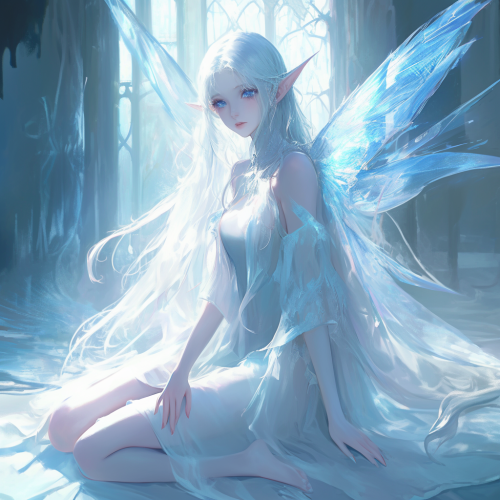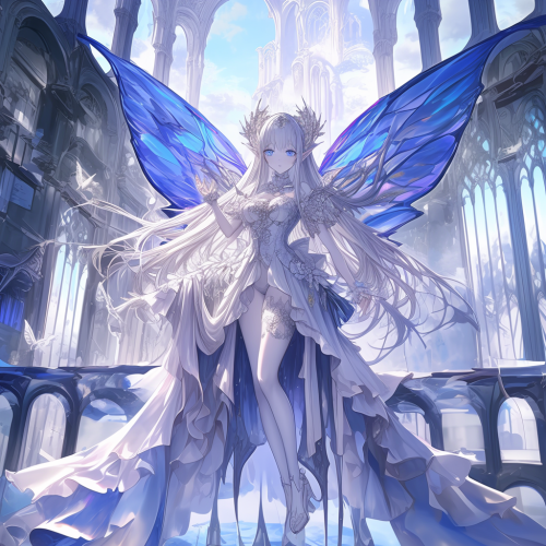 a beautiful female fairy, pale skin, long white hair, blue eyes, very long pointy ears, large beautiful white fairy wings, wearing a long thin white silk dress, no shoes, gigantic magical kingdom background, fantasy theme, fantasy setting --niji 6