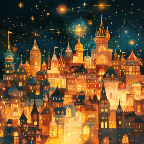 A magical city in the distance, shining with golden light, cartoon-style, colorful and radiant, simple shapes, gentle and dreamy design for young children, with stars and a glowing sky in the background.