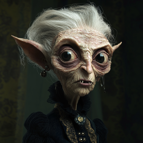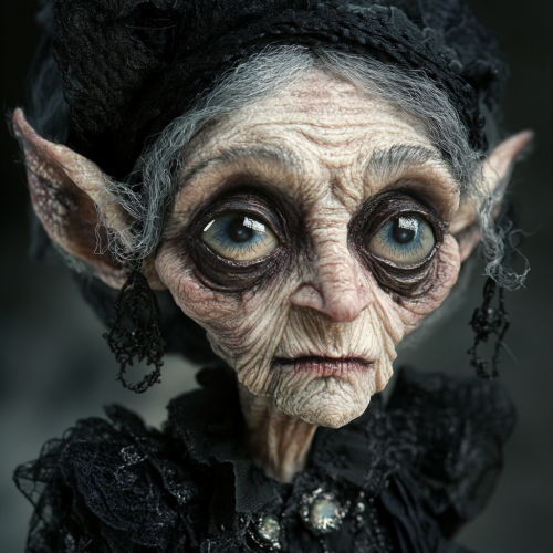 an elderly unseelie fey creature. She has exaggerated facial features (big eyes, nose, teeth, ears) She is old but menacing. She is dressed in fantasy Victorian clothing.