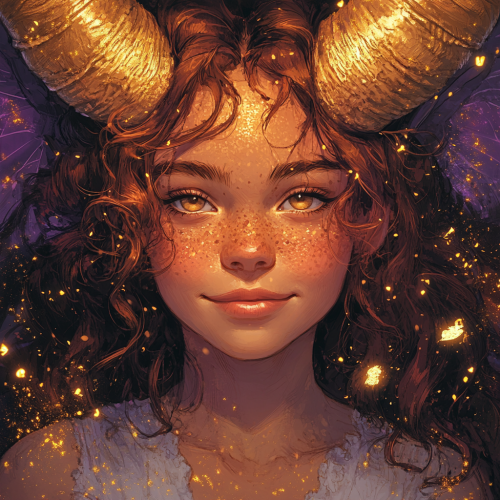 dungeons and dragons, illustration, half body portrait, comicbook artstyle, a fairy child, copper skin, curly brown hair, two satyr horns on her head, golden magical eyes, surrounded by golden magical glitter, small purple wings, kind, happy