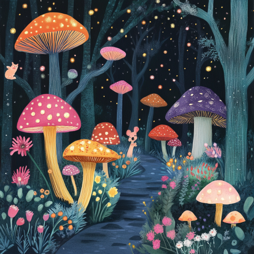 A magical forest scene with oversized, colorful mushrooms, playful animals peeking out from behind trees, and winding paths. Designated circular areas for stickers, surrounded by flowers and sparkling lights