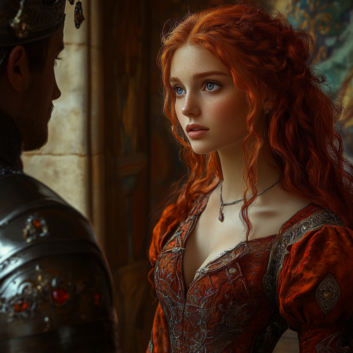photograph of realistic medieval fantasy princess, tall woman in her early twenties, fair skin, blue eyes, long fiery red hair, rounded features, heart shaped face, inside regal palace talking to captain of the royal guard, HD --ar 16:9