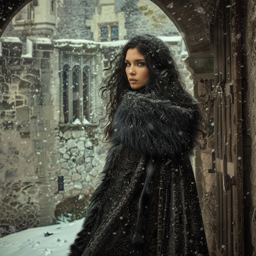 A beautiful dark-haired woman in a fur cloak standing in a castle courtyard in a blizzard, she is vibrant and Ethereal against the white of falling snow fantasy, magic, preraphaelite --v 6.0