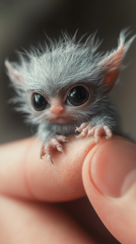 Photorealistic macro shot of a miniature newborn fairy perched on a human's thumb. Extreme close-up emphasizing the infant fairy's delicate features: wrinkled gray skin, oversized expressive eyes, and wisps of soft fur. The tiny creature clings to the thumb with its minuscule feet. Sharp focus on the fairy with a shallow depth of field blurring the human hand, accentuating the dramatic size difference. Studio lighting for crisp detail and textures. --ar 9:16 --v 6.1