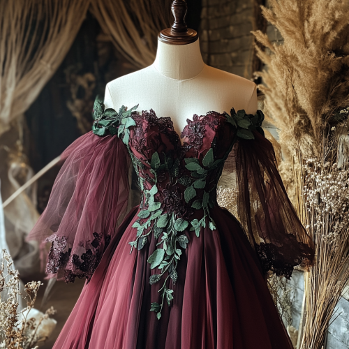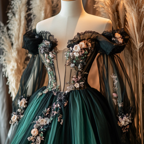 Create a fantasy-inspired, off-the-shoulder gown displayed on a mannequin. The dress is a deep green with sheer, ethereal sleeves adorned with floral appliqués cascading down the bodice and skirt. The bodice features a sweetheart neckline with intricate gathering and lace detailing, while the skirt flows elegantly, with layers of translucent fabric, giving it a mystical, enchanting vibe. The dress design includes rich textures and layers, with a blend of black and green tones that evoke a woodland or enchanted forest theme. Set the scene with soft, natural lighting, dried pampas grass, and muted floral arrangements nearby, creating a whimsical and romantic atmosphere.