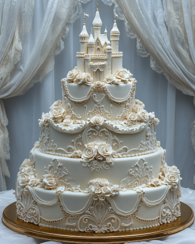 Create an extravagant and very tall and wide multi tiered round wedding cake. The top tier is a beautiful Cinderella's castle sculpture made of White chocolate white Rhinestones and gems. The base cake is white and light blue colors fondant. There are lots of elaborate royal icing filigree and paisley and swirl designs. Small clusters of small roses and ivy leaves. Thin fondant swags. The cake is displayed on a gold pedestal cake stand on a dessert table in a corner of a grand ballroom with beautiful curtains in the background and excellent lighting on the cake. --ar 4:5 --v 6.1 --stylize 500