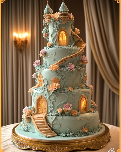 Create a very tall multi tiered wedding cake design that is inspired by Rapunzel's Tower from the Disney animated film. This is a very elaborate design that includes three towers combined to make one large and wide cake. Use light mint green color fondant that has small brick impressions in the fondant. Chocolate and Butterscotch buttercream fancy borders. Gold Royal icing fancy filigree and paisley and swirl designs. Small Roses in red and butterscotch and hot pink and gold. Rhinestones and gems. Green ivy vines. Ruffled fondant skirt around bottom base cake. This cake sits on a beautiful gold cake stand on a dessert table with layers of satin ruffle tablecloth. The background has curtains and there are spotlights on the cake. --ar 4:5 --v 6.1 --stylize 500