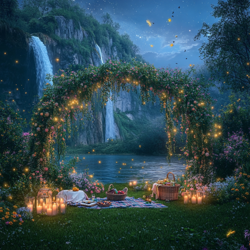 A magical wedding background with soft, pastel tones. Featuring a floral arch with blooming roses and peonies, delicate fairy lights twinkling overhead, and a gentle sunset sky in the distance. Elegant details like lace curtains and a cobblestone pathway covered in flower petals. The atmosphere is romantic, serene, and enchanting, perfect for creating cherished memories