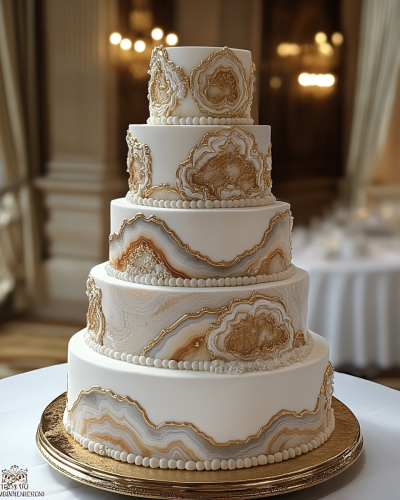 Create a tall multi tiered cake Iolani Palace as design inspiration. Use white iridescent shimmer fondant that has a marbleized design using bright white and butterscotch and grey and gold colors on the base cake. Geode design style. Use bright white and butterscotch colors. Shiny Gold Royal icing filigree and paisley and swirls designs. Thin fondant swags. The cake is displayed in a beautiful ballroom setting in a gold cake stand on a dessert table that has layers of gold and white ruffle tablecloth. There are swag curtains in the background and spotlights in the cake. --ar 4:5 --v 6.1 --stylize 500