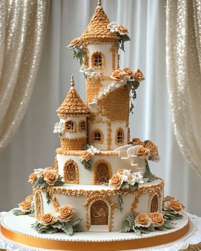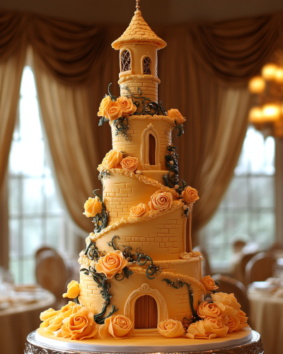 Create a very tall multi tiered wedding cake design that is inspired by Rapunzel's Tower from the Disney animated film. This is a very elaborate design. Use light terra cotta color fondant that has small brick impressions in the fondant. Chocolate and Butterscotch buttercream fancy borders. Gold Royal icing fancy filigree and paisley and swirl designs. Small Roses in orange and butterscotch and mahogany and gold. Rhinestones and gems. Green ivy vines. Ruffled fondant skirt around bottom base cake. This cake sits on a beautiful gold cake stand on a dessert table with layers of satin ruffle tablecloth. The background has curtains and there are spotlights on the cake. --ar 4:5 --v 6.1 --stylize 500