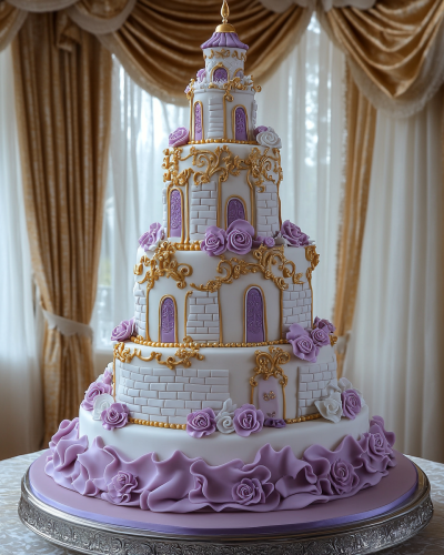 Create a very tall multi tiered wedding cake design that is inspired by Rapunzel's Tower from the Disney animated film. This is a very elaborate design. Use Lavender fondant that has small brick impressions in the fondant. Bright white and purple buttercream fancy borders. Gold Royal icing fancy filigree and paisley and swirl designs. Small Roses in white and hot pink and purple and gold. Rhinestones and gems. Green ivy vines. Ruffled fondant skirt around bottom base cake. This cake sits on a beautiful silver cake stand on a dessert table with layers of satin ruffle tablecloth. The background has curtains and there are spotlights on the cake. --ar 4:5 --v 6.1 --stylize 500