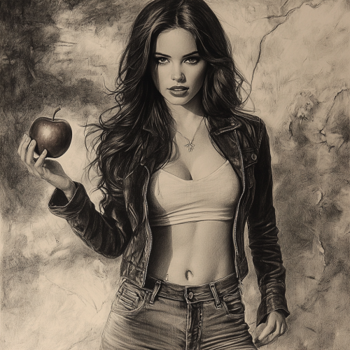 the poisoned apple being held by Snow White , she wears jeans and a leather jacket, full body drawing in a confronting pose, surreal background, hyperrealistic pencil drawing, strong light and shade contrast