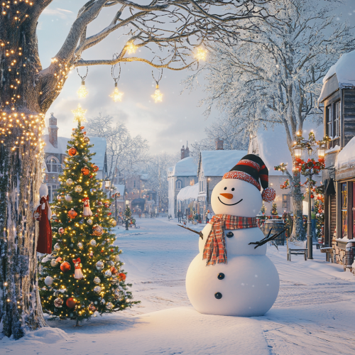 Medium Shot, front view, hyper realistic, winter, afternoon, snowy, European country style, fairytale atmosphere, snowman, lovely, snowy town and Christmas tree, decorations, large square, festival, Canon EOS R5 with a 200mm lens, --style raw --v 6.1 --ar 1:1
