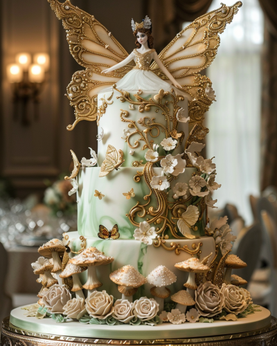 Create a beautiful fantasy themed cake that is very tall and multi tiered wedding cake. The base cake is fondant that has a marbleized design using bright white and green and mint and gold colors. Gold Royal icing filigree and paisley and swirls designs. Toad stool mushrooms of all shapes are made out of fondant. A beautiful Rococo Victorian fairy with very large and tall wings. Butterflies on the cake. Baby roses in lavender and white with filler flowers and ivy. Rhinestones and gems. This cake sits in a fancy gold cake stand on a dessert table in a banquet hall. Spotlights on the cake and curtains in the background. --ar 4:5 --v 6.0 --stylize 300
