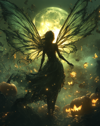 Create a scary Fairy flying in a spooky forest with a full moon in Halloween night. Her wings are extremely tall and her style is tattered Rococo design. She is casting a spell on a pumpkin patch. There is a lot of spiral smoke rising and sparkling and glitter. She is facing front and waving her magic wand. Use lots of vibrant fall colors. --ar 4:5 --v 6.1 --stylize 300