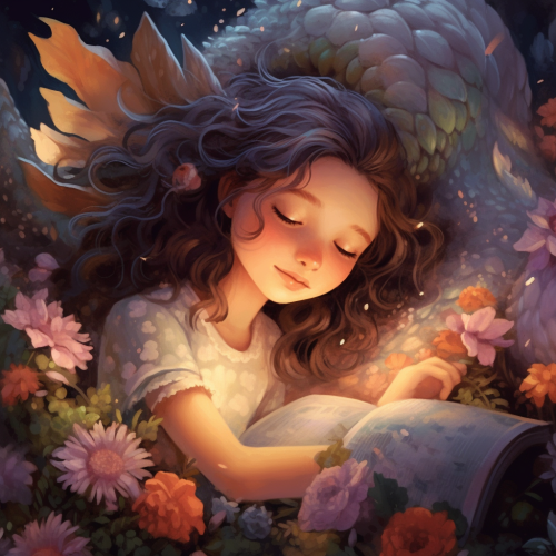 illustration , A young girl peacefully sleeping in a bed of flowers, cradled by a gentle, glowing dragon curled protectively around her. Soft, magical lighting fills the scene, with warm, pastel colors and floating glowing butterflies adding to the dreamy, fairytale atmosphere. Whimsical and comforting, like a scene from a bedtime story --v 5.1 --s 250 --style raw