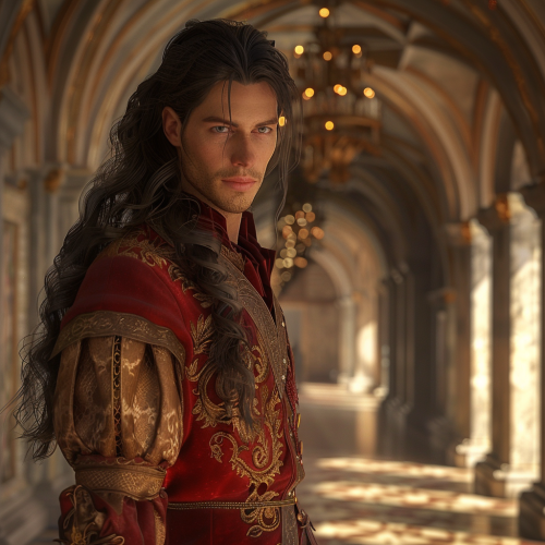 A handsome prince with long dark hair in Crimson and gold clothes in an ivory castle corridor looking smug and mysterious, fantasy, magic, unreal engine --v 6.0