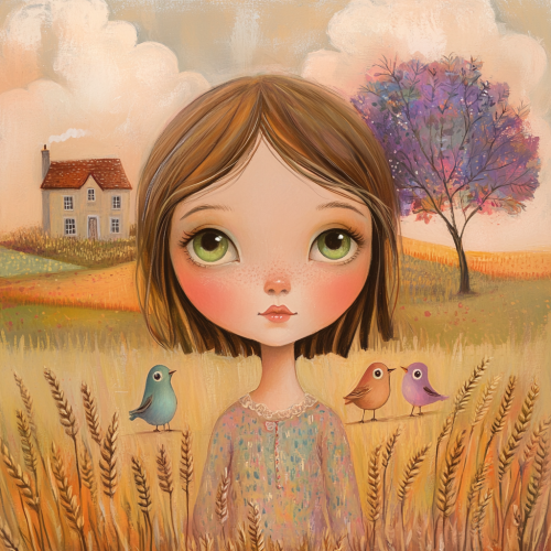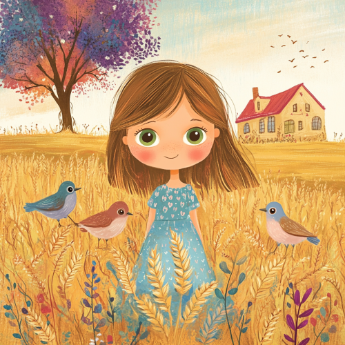 A whimsical illustration of a sweet girl with blushing cheeks. 2 cuckoos, brown hair, big green eyes, a beautiful girlish dress, standing in a wheat field and picking wheat in the background, a small dreamy, beautiful country house with a tree in the garden with purple, red and blue leaves at dusk. A stunning children's book style dreamy illustration