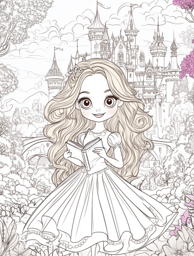 A coloring cover of an adorable princess with big, sparkling eyes and long, curly hair wearing her royal gown, standing in front of the castle and holding a book, in a simple cartoon style colourful. The princess has a bright smile and is ready for adventure. In the background, there's a beautiful palace with turrets and a drawbridge, surrounded by lush greenery and blooming flowers. It feels as if she has just come from inside one of these castles. --ar 49:64