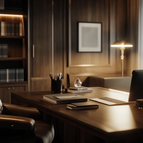 Elegant office background for finance videos. Classy, not too formal. Light from behind the camera and side window light. Clean desk, modern touches, inviting vibe.