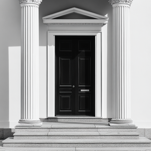 mono colour clean logo for a established financial firm, base it off the portara door and greek pillar architecture. make it subtle and clean, black and white. make it a doorway.