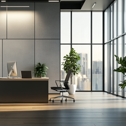 Modern office background for financial investment videos, classy but approachable. Two light sources: one from behind the camera, one from the side as afternoon window light. Elegant decor, minimalist desk, a few plants.