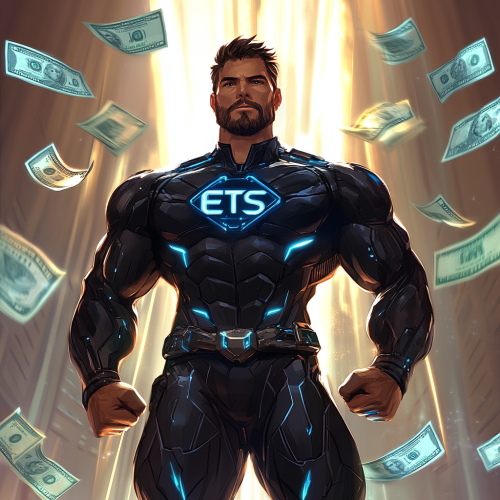 A muscular superhero figure standing confidently with his hands on his hips, wearing a sleek, futuristic black and blue suit with glowing accents. His chest features a large emblem that reads 'ETS.' He has a luxurious, ornate rug flowing dramatically behind him like a cape. The background showcases bright, radiant beams of light, and floating dollar bills surround the scene, symbolizing wealth and success. The superhero has a thick beard and styled hair, with a bold and determined expression. The atmosphere conveys strength, financial power, and confidence
