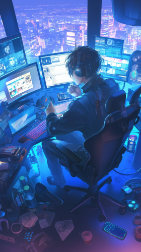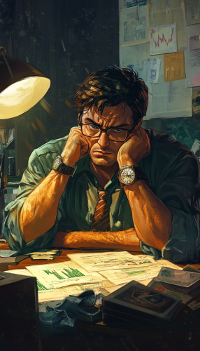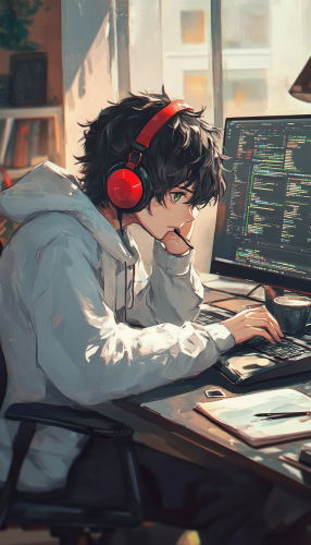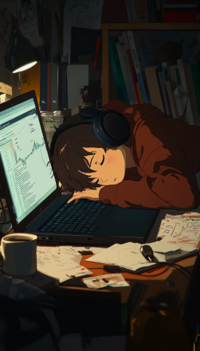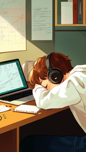 estilo anime, joven recostado en un escritorio con audifonos puestos, cansado de trabajar, en el escritorio una laptop donde se aprecian graficos de forex, tiene anotaciones en una libreta y una taza de cafe,--v 6.1 --ar 4:7