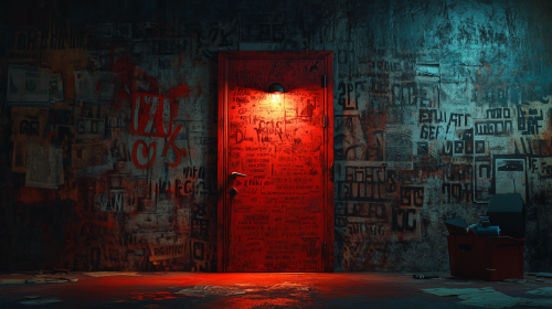 a wall on the whole screen, painted with inscriptions about UX / UI Design, in the middle of the wall an opening door. Behind the door you can see light and money. RealizM --ar 16:9