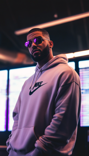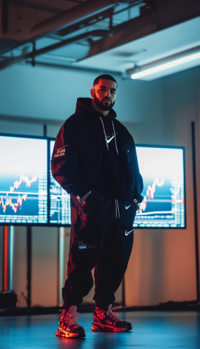 "Drake posing in a brightly lit room, wearing a Nike hoodie and an urban style with a lot of flow. Behind him are two screens displaying forex charts with a white background.--v 6.1 --ar 4:7