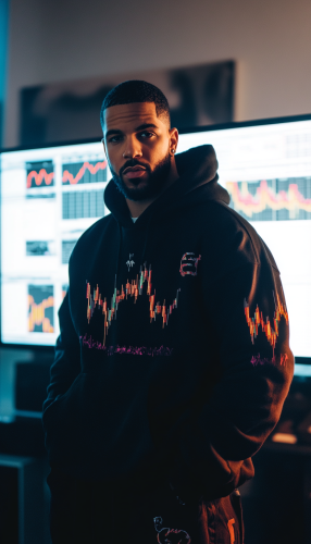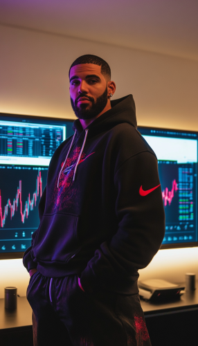 "Drake posing in a brightly lit room, wearing a hoodie and an urban style with a lot of flow. Behind him are two screens displaying forex charts with a white background.--v 6.1 --ar 4:7