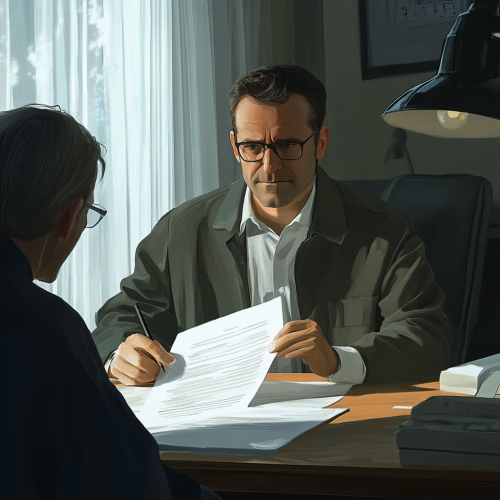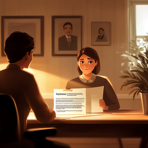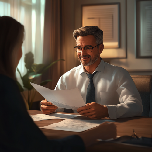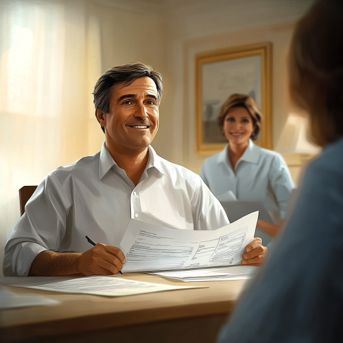 Depicts a professional, hopeful scene of a man sitting at a desk, reviewing financial documents with a relaxed and optimistic expression, symbolizing debt restructuring and recovery. In the background, a financial advisor offers with a reassuring smile Guidance, emphasizing trust and support. The lighting is soft and warm, creating a sense of calm and security. The picture is rendered in a high-definition movie style and is realistic and realistic. The detailed texture of the document, subtle lighting and realistic expressions convey the idea of financial rebirth. Theme and freshness.