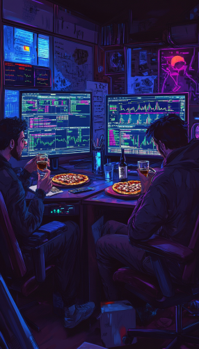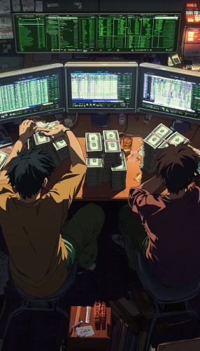 "Anime style, two friends eating pizza and laughing while drinking whiskey, sitting at a desk. In front of them are two screens displaying forex charts. They are very relaxed.--v 6.1 --ar 4:7
