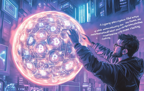 "A glowing sphere filled with cryptocurrency symbols representing the future of finance, one figure enthusiastically holding it up while another cautiously places a regulatory net over it. The backdrop shows futuristic and traditional cityscapes clashing. Color pencil shading with marker lines, realistic style." --ar 8:5