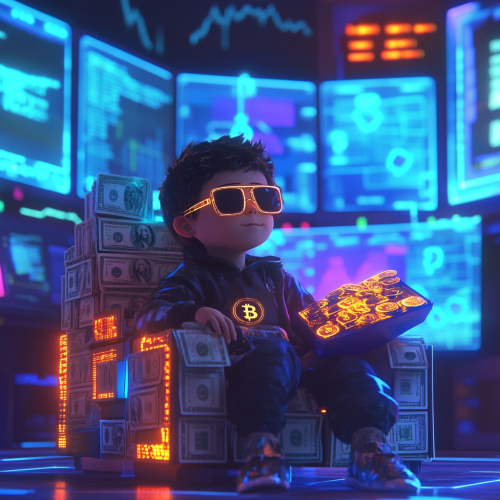 Create a futuristic scene featuring a cool young boy wearing sunglasses, seated on a chair made entirely of dollar bills. Behind him, multiple glowing computer screens display high-tech graphics. The boy holds an open briefcase filled with glowing Bitcoin and Ethereum coins, casting a soft light on his surroundings. The atmosphere is sleek and tech-forward, with the room's neon lights adding a vibrant, modern touch to the overall composition. The design should feel dynamic and futuristic, highlighting the world of cryptocurrency and technology