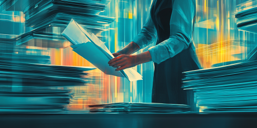 Generate a digital art for Digital art of a person organizing multiple financial documents into one folder, symbolizing debt consolidation. The background features a calm, structured environment with shades of #0A6572, emphasizing clarity and organization. --ar 2:1