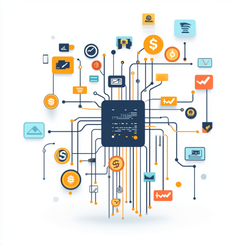 modern illustration on a white background featuring a central futuristic API server with luminous circuits and data connections extending outward. The server is surrounded by floating financial icons, such as coins, message bubbles, bank transfer symbols, and transaction icons. These elements appear to be carried along by the server's glowing connections, symbolizing the seamless management of financial data and transactions. The design is minimalist, with a focus on fintech innovation, digital finance, and the flow of data in financial services, white background, dramatic, zoomed.