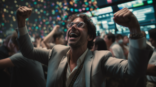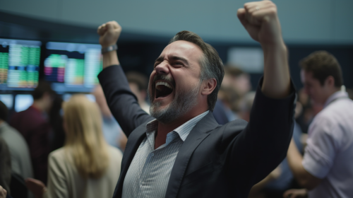 A jubilant day trader celebrating stock market gains at a lively stock exchange, traders cheering in the background, energetic and euphoric atmosphere, journalistic photography with a zoom lens, --ar 16:9 --v 5.0