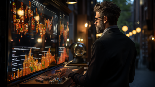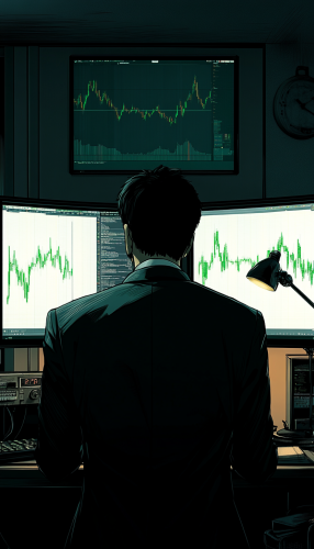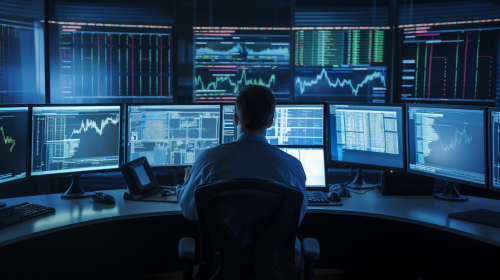 A stock market trader intensely focused on multiple computer screens, surrounded by charts, financial data, and flashing stock tickers, bathed in the bluish glow of monitors, capturing the high-pressure environment of modern finance, Photography, DSLR camera with a telephoto lens (100mm), shallow depth of field settings, --ar 16:9 --v 5.0