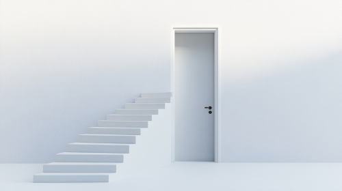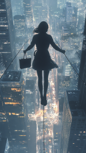 The Journey Upward Concept in corporate world: Maya is depicted climbing a steep corporate ladder or staircase, with symbols of career success like documents, graphs, and briefcases attached to the steps. Above, glowing lights or open doors await. --ar 9:16 --v 6.1