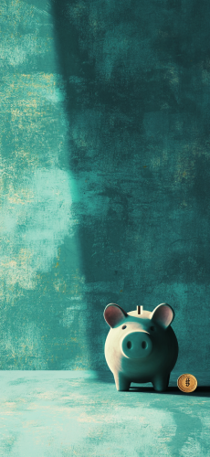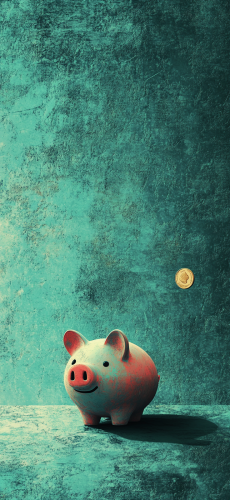 Generate a digital art for A small piggy bank with a coin being inserted into it, positioned on the right side of the screen. The background is textured with the primary color #0A6572, creating contrast between light and dark shades of teal. A subtle shadow falls across part of the textured surface below the piggy bank, adding depth to the scene. The atmosphere conveys elements from real-world financial iconography. . --ar 443:960