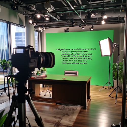 "Background scene for filming financial investment videos, designed for use with a green screen. The scene is professional yet approachable, offering a serious but not overly formal atmosphere. A modern and elegant workspace with a sleek desk, subtle decor, and a few plants. There are two light sources: one coming from behind the camera, creating soft front lighting, and another from behind and to the side, simulating sunlight entering through a window as it would appear in the early afternoon. Classy but not pretentious."