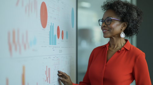 a middle aged businesswoman standing in front of a whiteboard, smirking, smiling, black woman, positive outlook, eureka, with charts and data behind her representing business assessment insights. Professional woman age 50, in a business setting standing in front of a whiteboard, analyzing data with graphs. Wearing red and blue. Keywords: professional, insightful, business analysis. Camera: DSLR, Lens: 85mm. Post: Neutral, clean lines with high contrast. --ar 16:9 --v 6.1