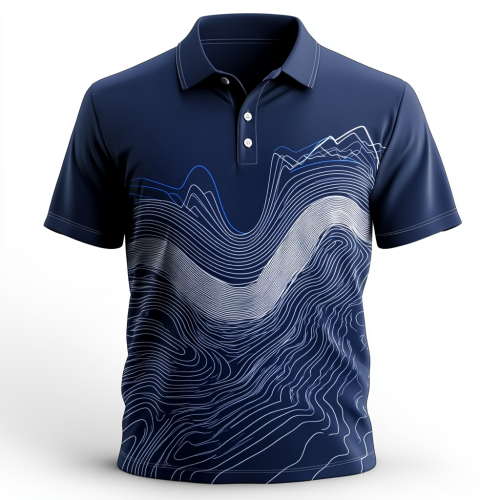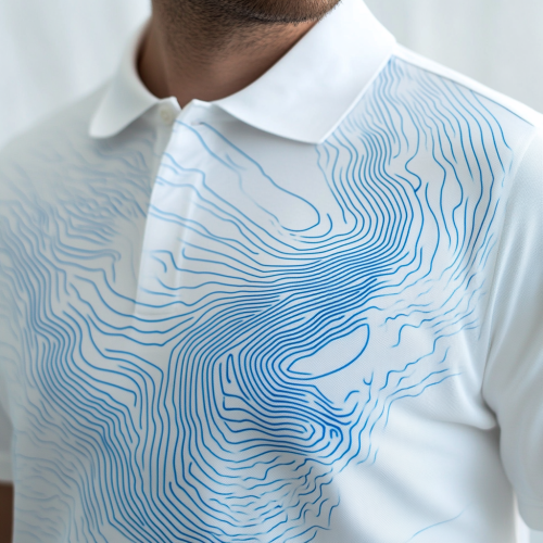 ultra-detailed abstract lines symbolizing tech, computations, investing and neural networks with white background and blue uprising curve on white polo shirt