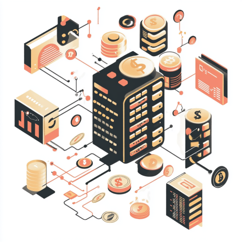 illustration of an API Server working in finance, mesaages, coins aound it depicts as it was carying these elements where it goes, white background, fintech, fiancne